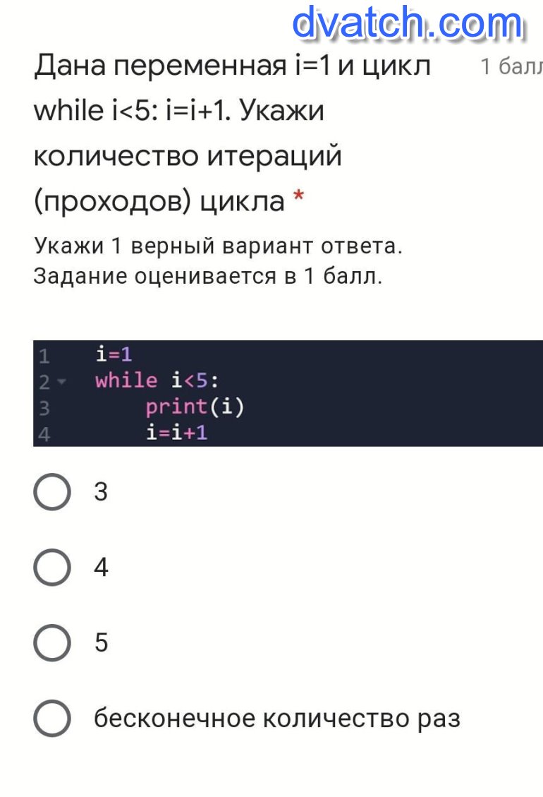 Дана переменная i=1 и цикл while i<5: i=i+1. Укажи количество итераций (проходов) цикла *