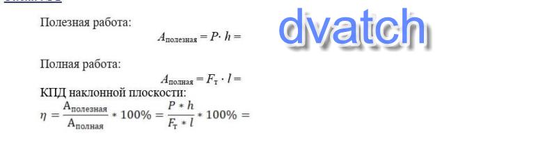 Полезная работа:Aполезная = Р⋅ h = Полная работа:Aполная = Fт ⋅ l = КПД наклонной плоскости:ДАЮ 60 поинтов
