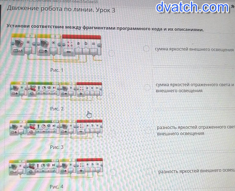 Движение робота по линии. Урок 3станови соответствие между фрагментами программного кода и их описаниями. сумма яркостей внешнего освещениРис. 1. сумма яркостей отраженного света ивнешнего освещенияРИС. 2муразность яркостей отраженного светавнешнего освещенияРис. 3разность яркостей внешнего освещенияРис. 4- Назад| Програмен и