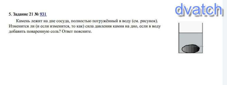где ρ — плотность воды, V — объём камня, g — ускорение свободного падения. Так как объём камня и ускорение свободного падения не изменятся, а плотность воды увеличится, то сила Архимеда, действующая на камень, возрастёт. Сила тяжести, действующая на камень, также не изменится, так как не меняется масса камня. Таким образом, разность силы тяжести и силы Архимеда станет меньше, и сила давления камня на дно уменьшится.