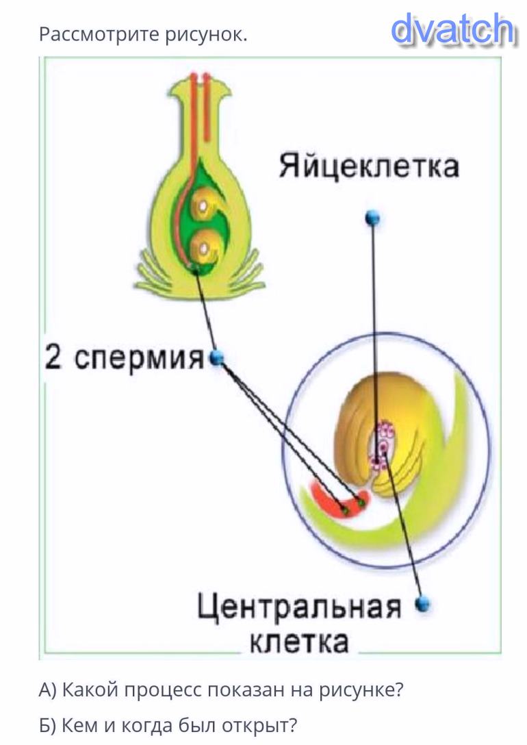 Изображено двойное оплодотворение цветковых растений. Этот процесс был открыт Навашиным в 1898