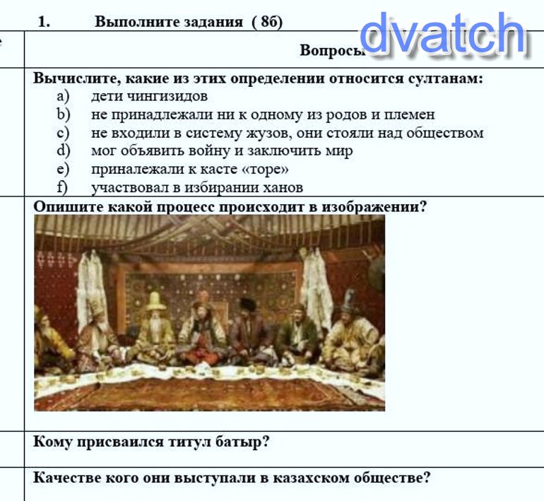 Султан Вычислите, какие из этих определении относится султанам:a) дети чингизидов b) не принадлежали ни к одному из родов и племенc) не входили в систему жузов, они стояли над обществомd) мог объявить войну и заключить мирe) приналежали к касте «торе»f) участвовал в избирании ханов