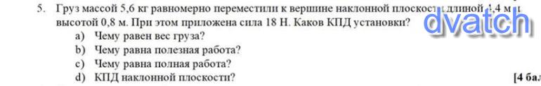 Груз массой 5,6кг равномерно переместили к вершине наклонной плоскости длинной 4,4м и высотой 0,8м . При этом приложена сила 18H. Каков КПД установки ?а) Чему равен вес груза ?b) Чему равна полезная работа ?c) Чему равна полная работа ?d) КПД наклонной плоскости ? посчитайте СОЧ
