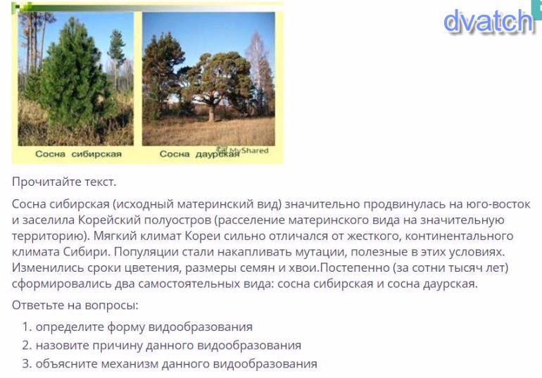 Прочитайте текст. Сосна сибирская (исходный материнский вид) значительно продвинулась на юго-восток и заселила Корейский полуостров (расселение материнского вида на значительную территорию). Мягкий климат Кореи сильно отличался от жесткого, континентального климата Сибири. Популяции стали накапливать мутации, полезные в этих условиях. Изменились сроки цветения, размеры семян и хвои. Постепенно (за сотни тысяч лет) сформировались два самостоятельных вида: сосна сибирская и сосна даурская. Ответьте на вопросы: 1. определите форму видообразов-я2. назовите причину данного видообр-я3. объясните механизм данного видообр-я