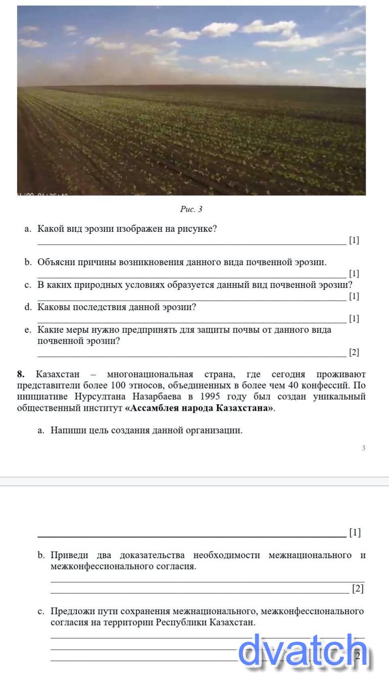 Рассмотри рисунок 3 и ответь на вопросы. Рис. 3a. Какой вид эрозии изображен на рисунке?_____________________________________________________________ [1]b. Объясни причины возникновения данного вида почвенной эрозии. _____________________________________________________________ [1]c. В каких природных условиях образуется данный вид почвенной эрозии? _____________________________________________________________ [1]d. Каковы последствия данной эрозии?_____________________________________________________________ [1]e. Какие меры нужно предпринять для защиты почвы от данного вида почвенной эрозии?_____________________________________________________________ [2]8. Казахстан – многонациональная страна, где сегодня проживают представители более 100 этносов, объединенных в более чем 40 конфессий. По инициативе Нурсултана Назарбаева в 1995 году был создан уникальный общественный институт «Ассамблея народа Казахстана». a. Напиши цель создания данной организации. _____________________________________________________________ [1]b. Приведи два доказательства необходимости межнационального и межконфессионального согласия. _________________________________________________________________________________________________________________________ [2]c. Предложи пути сохранения межнационального, межконфессионального согласия на территории Республики Казахстан. _______________________________________________________________________________________________________________________________________________________________________________________ [2]