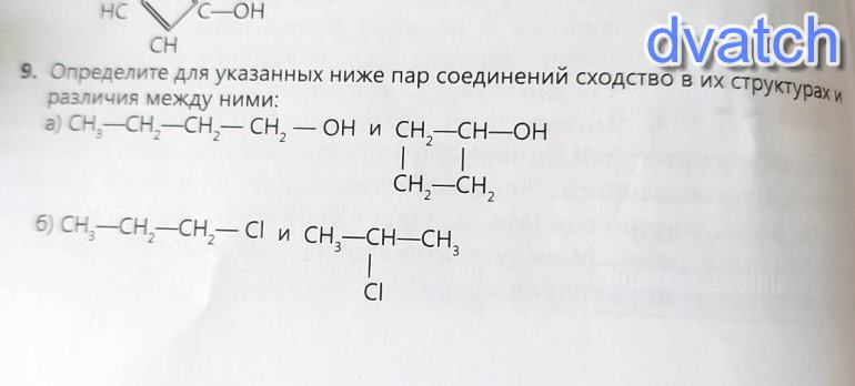 9. а) Сходства: 4 углерода в цепи, отношение к классу спиртов из-за наличия ОН группы; Различия: во втором веществе углеродная цепь замкнута, образует циклобутанол.