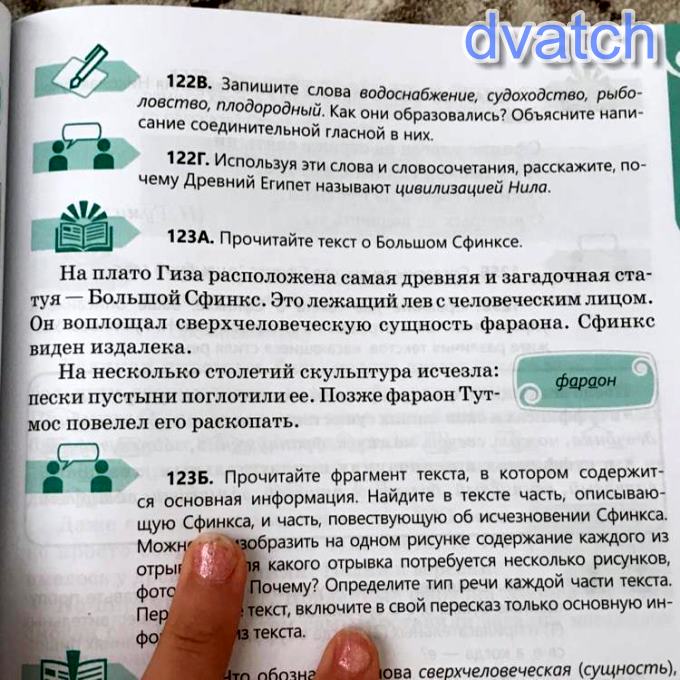 123Б. Прочитайте фрагмент текста, в котором содержит-ся основная информация. Найдите в тексте часть, описываю-щую Сфинкса, и часть, Повествующую об исчезновении Сфинкса. Можно ли изобразить на одном рисунке содержание каждого изотрывков? Для какого отрывка потребуется неКак узнать сколько рисунков,фотографий? Почему? Определите тип речи каждой части текста. Перескажите текст, включите в свой пересказ только основную ин-формацию из текста.