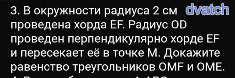Рассмотрим ∆ОМE и ∆OMF. Эти треугольники прямоугольные так как высота ОМ образует прямой угол, и ОМ, ЕМ и FM – катеты, а ОЕ и OF - гипотенузы. У них: