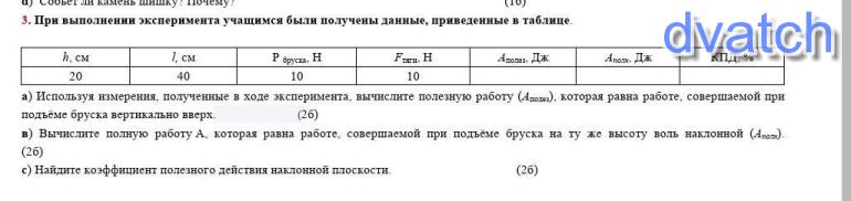 в) Вычислите полную работу А, которая равна работе, совершаемой при подъёме бруска на ту же высоту воль наклонной (Aполн). (2б)