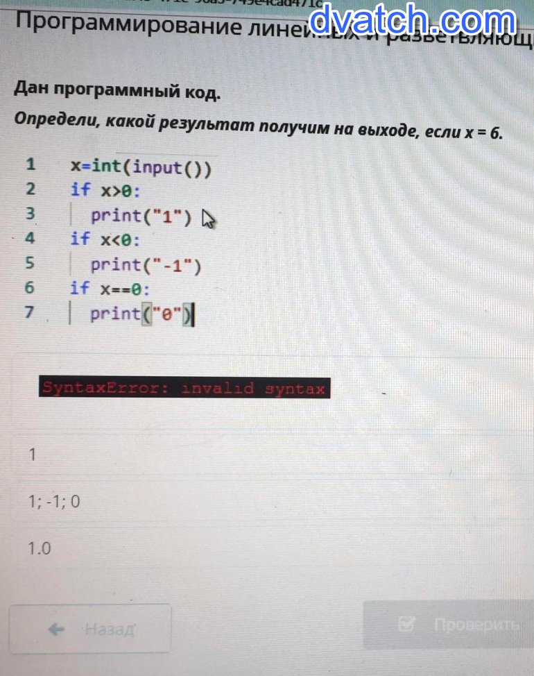 Дан программный код. Определи, какой результат получим на выходе, если х= 6. 1 x=int(input)2 if x>0:3 print("1")if x<e:5 print("-1")6 if X==e:7. print(""))2