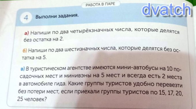 4 Выполни задания. а) Напиши по два четырёхзначных числа, которые делятся без остатка на 2. 6) Напиши по два шестизначных числа, которые делятся без ос- татка на 5. в) В туристическом агентстве имеются мини-автобусы на 10 по- садочных мест и минивэны на 5 мест и всегда есть 2 места в автомобиле гида. Какие группы туристов удобно перевезти без потери мест, если приехали группы туристов по 15, 17, 20, 25 человек?