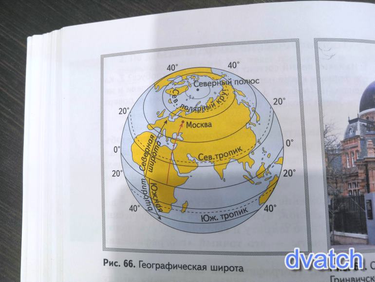 Под географической широтой понимают величину дуги от экватора к северу или к югу до заданной точки. Она тоже измеряется в градусах, так как широта точки есть угол между отвесной линией, проходящей через эту точку, и плоскостью экватора. Чтобы определить географическую широту какого-либо объекта, нужно определить параллель, на которой он находится. Например, Санкт-Петербург имеет широту, равную 60° северной широты, потому что он расположен на параллели, отстоящей от экватора на 60°. Что же делать, если объект расположен не на изображенных параллелях, а между ними? Для этого надо определить широту ближайшей к объекту параллели со стороны экватора и к ней прибавить число градусов дуги меридиана от параллели до объекта. Например, Москва располагается севернее параллели 50°. Число градусов по меридиану между этой параллелью и Москвой равно 6. Значит, географическая широта Москвы будет 56°. Так как этот город лежит к северу от экватора, то широта будет северной.