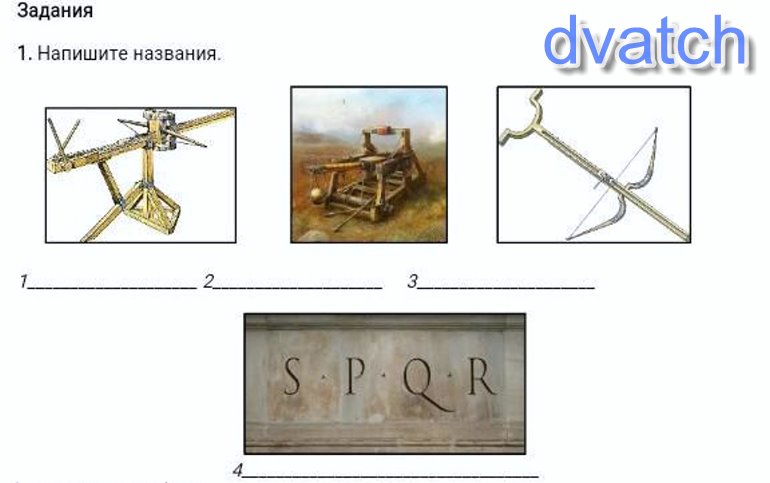 1. Ручная римская баллиста 2. Катапульта 3. Гастрафет 4. "Senatus Populusque Romanus"- "Сенат и народ Рима"