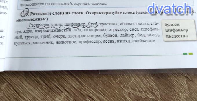 Ра-скра-ска; я-щик; ши-фонь-ер; Я-губ; трост-ник; об-ла-ко; гвоздь; ста-ту-я; яд-ро; азер-бай-джан-ский; лёд; га-зо-про-вод; аг-рес-сор; снег; те-ле-фон-ный; трус-ца; гриб; о-черк; элек-тро-стан-ци-я; буль-он; лай-нер; йод; въезд, ку-пать-ся; мо-лоч-ник; жи-вот-но-е; про-фес-сор; я-сень; взгляд; снаб-же-ни-е.
