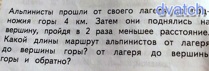 s2=½s1 => s2= ½×4=2 (км), значит расстояние от лагеря до вершины это сумма s1 и s2 т. е. 6 км. Расстояние туда и обратно в два раза больше – 12 км