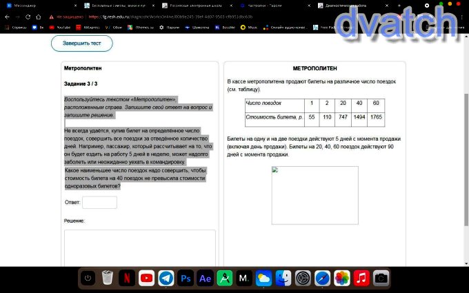 Воспользуйтесь текстом «Метрополитен», расположенным справа. Запишите свой ответ на вопрос и запишите решение. Не всегда удаётся, купив билет на определённое число поездок, совершить все поездки за отведённое количество дней. Например, пассажир, который рассчитывает на то, что он будет ездить на работу 5 дней в неделю, может надолго заболеть или неожиданно уехать в командировку. Какое наименьшее число поездок надо совершить, чтобы стоимость билета на 40 поездок не превысила стоимости одноразовых билетов?