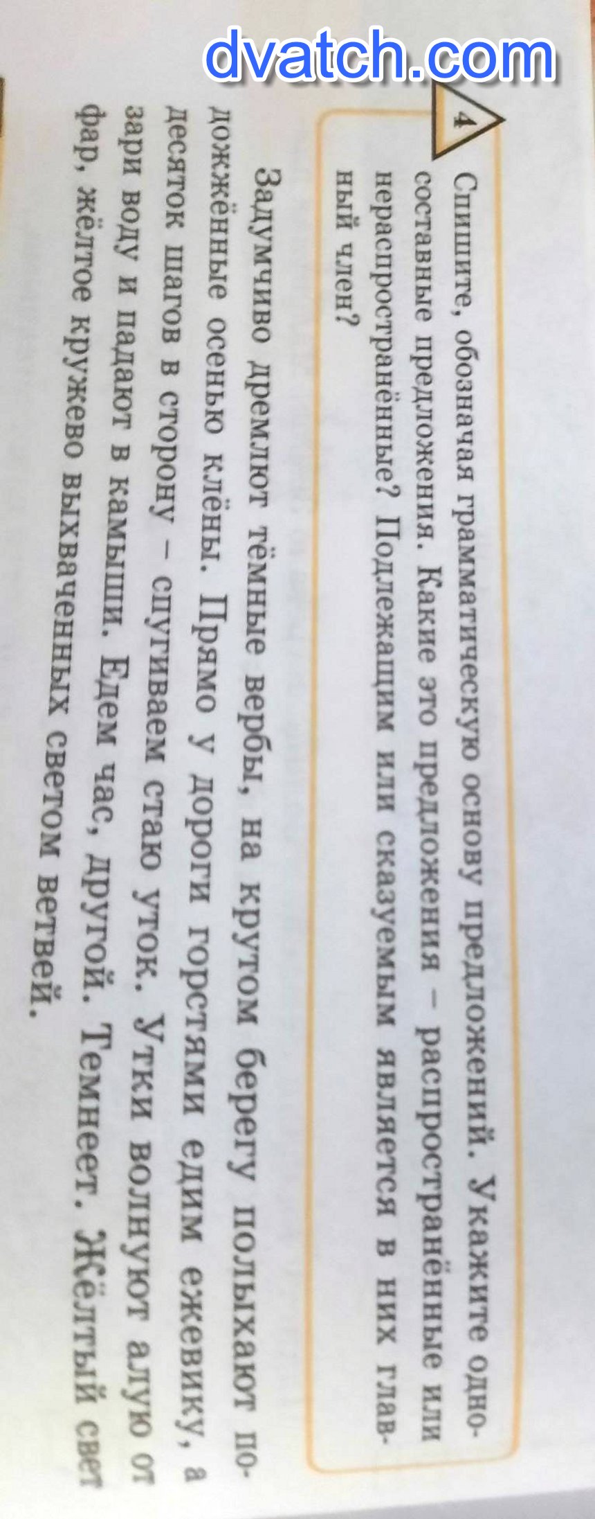 :Задумчиво дремлют тёмные вербы, на крутом берегу полыхают подожжённые осенью клёны. Прямо у дороги горстями едим ежевику, а десяток шагов в сторону - спугиваем стаю уток. (Односоставное предложение, два сказуемых, распространённое). Утки волнуют алую от зари воду и падают в камыши. Едем час, другой. (Односоставное предложение, одно сказуемое, распространённое). Темнеет. (Односоставное предложение, одно сказуемое, нераспространённое). Жёлтый свет фар, жёлтое кружево выхваченных светом ветвей. (Односоставное предложение, два подлежащих, распространённое).