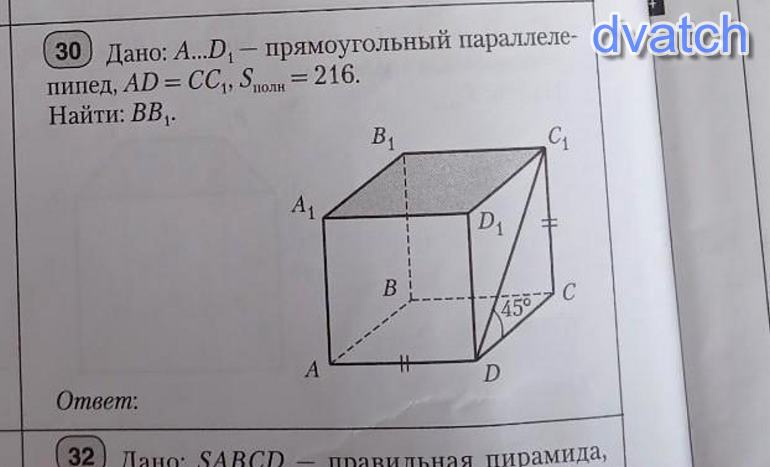 ABCDA1. …D1 - прямоугольный параллелепипед, Sполн. пов =216, AD=CC1, <C1DC=45°.