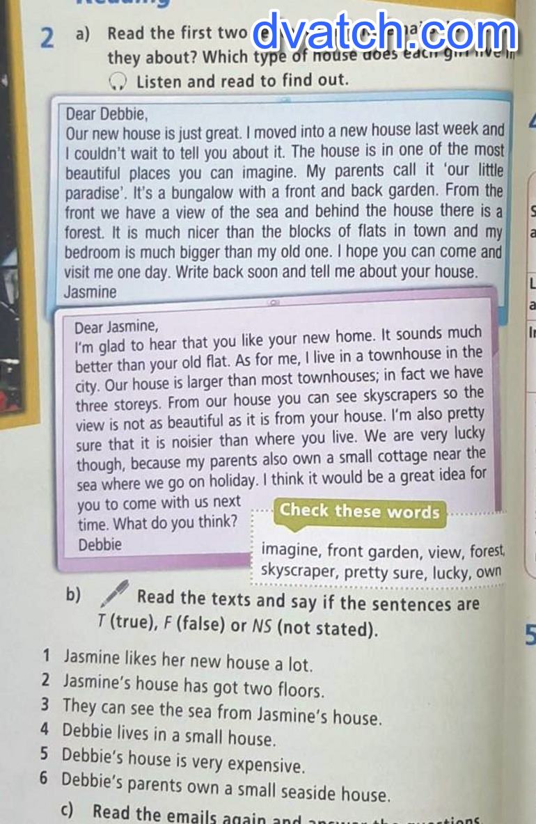 посчитайте b) Read the texts and say if the sentences are T (true), F (false) or NS (not stated). 1 Jasmine likes her new house a lot. 2 Jasmine's house has got two floors. 3 They can see the sea from Jasmine's house. 4 Debbie lives in a small house. 5 Debbie's house is very expensive. 6 Debbie's parents own a small seaside house.