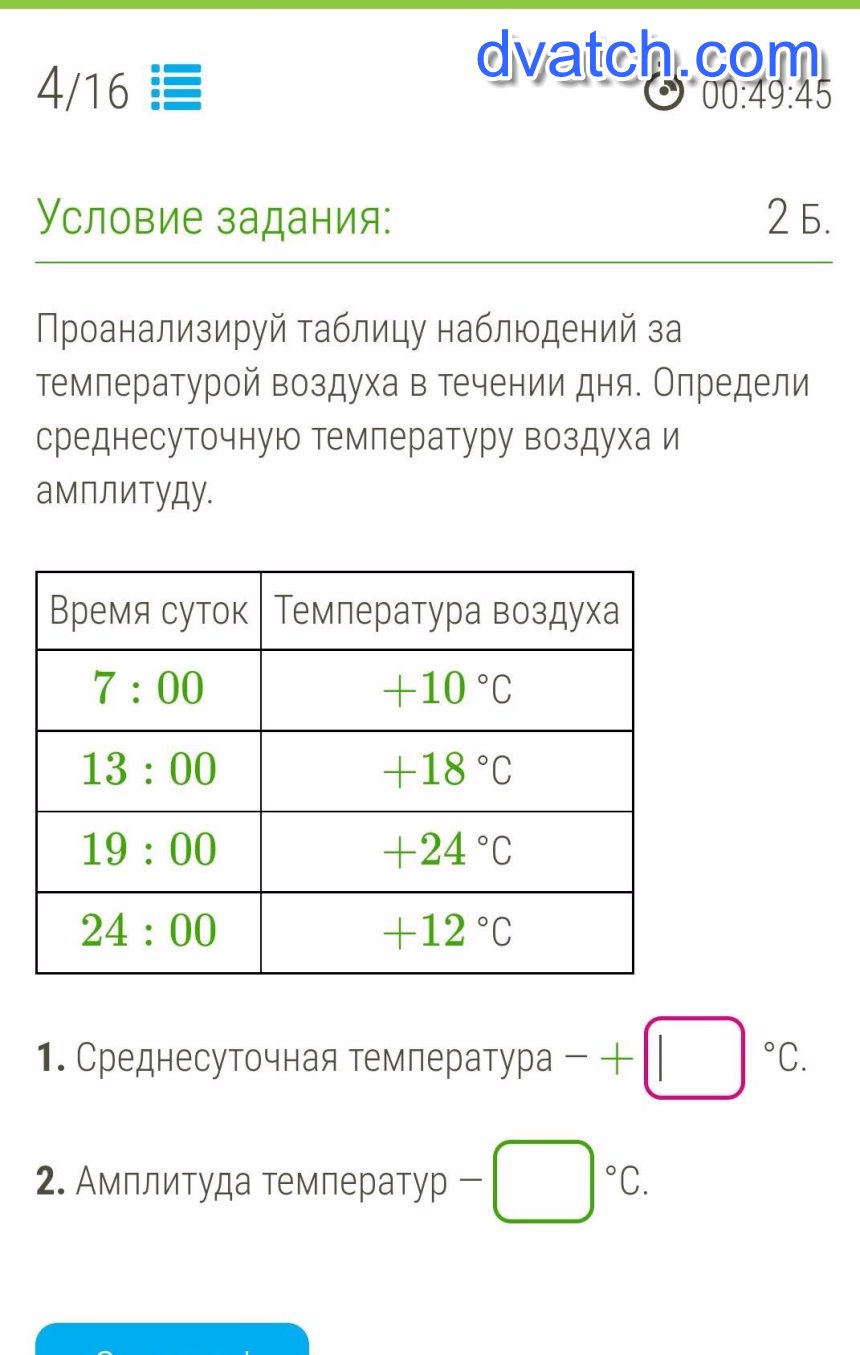 1. Что бы вычислить среднесуточную температуру, нужно сложить все данные значения и поделить на их количество.
