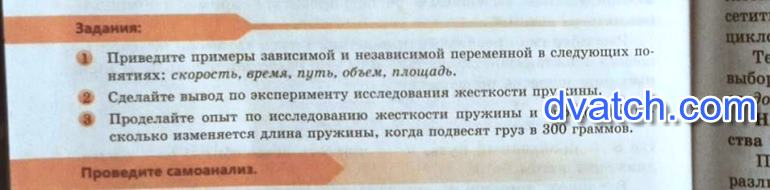 Задания: 1 Приведите примеры зависимой и независимой переменной в следующих по- нятиях: скорость, время, путь, объем, площадь. 2 Сделайте вывод по эксперименту исследования жесткости пружины. 3 Проделайте опыт по исследованию жесткости пружины и определите, на- Как узнать сколько изменяется длина пружины, когда подвесят груз в 300 граммов.
