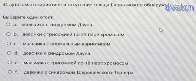 44 аутосома в кариотипе и отсутствие тельца Барра можно обнаружить у с. мальчика с нормальным кариотипом.