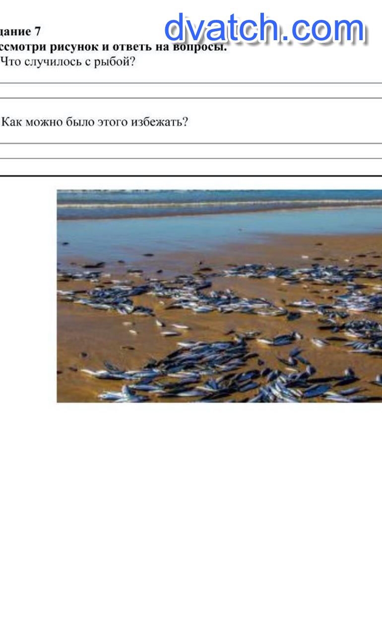 1) Рыба погибла, она выплыла вся на берег. Известно всем что рыба не может долго находится без воды, она не приспособлена жить на суше.