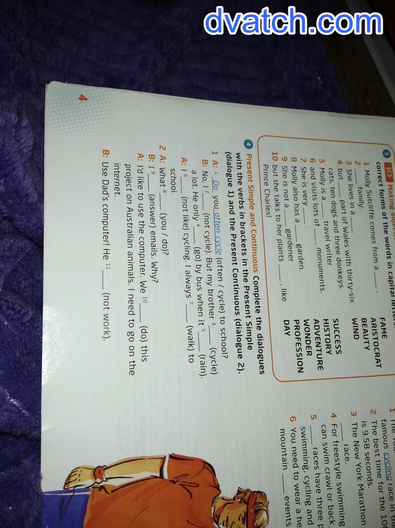 2. i don’t cycle 3. cycles 4. goes 5. rains 6. i don’t like 7. walk 8. what are you doing? 9. I’m answering emails 10. we are doing 11. he isn’t working