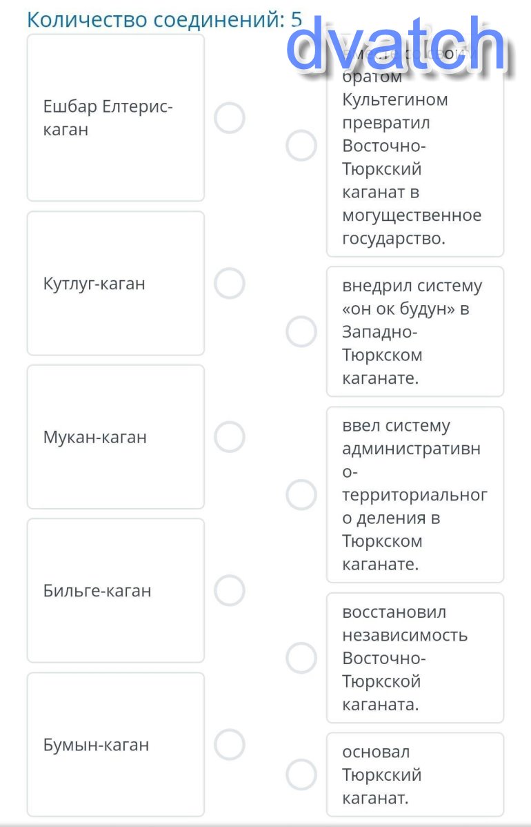 Сопоставь каганов, правителей тюркск х эпохи, с их деятельностью. Количество соединений: 5 Ешбар Елтерис каган вместе со своим братом Культегином превратил Восточно Тюркский каганат в могущественное государство. внедрил систему «он ок будун» в Западно Тюркском каганате. ввел систему административн O территориальног о деления в Тюркском каганате. восстановил независимость Восточно Тюркской каганата. основал Тюркский каганат. Кутлуг-каган Мукан-каган Бильге-каган Бумын-каган