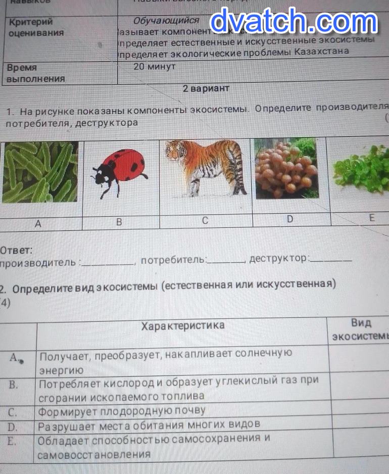 1. На рисунке показаны компоненты экосистемы. Определите производителя,