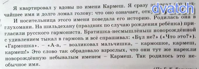 Я квартировал у вдовы по имени Кармеш. Я сразу записал это ред- чайшее имя и долго ломал голову: что оно означает, откуда пришло. и носительница этого имени поведала его историю. Родилась она в глухомани. На шильдехану (праздник по случаю рождения ребёнка) при- гласили русского гармониста. Братишка-несмышлёныш новорождённой с удивлением тыкал в гармонь и всё спрашивал: «Бұл не?» («Что это? » ). «Гармошка». «А-а, возликовал мальчишка, кармошке, кармен, кармеш » Это слово так обрадовало взрослых, что они тут же нарекли новорождённую небывалым именем Кармеш. Так родилось это не- обычное имя. 2 вопроса пж