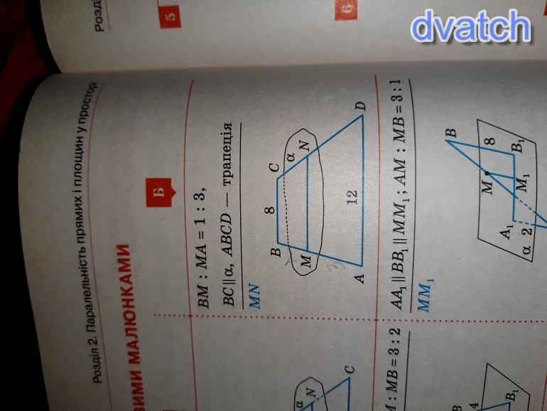 Если BC параллельна плоскости а, то она параллельна любой прямой, лежащей в этой плоскости, т. е. ВС || MN => MBCN ~ ABCD. Поскольку трапеции подобные, то и соственные стороны у них тоже подобны. Запишем отношение следующим образом: