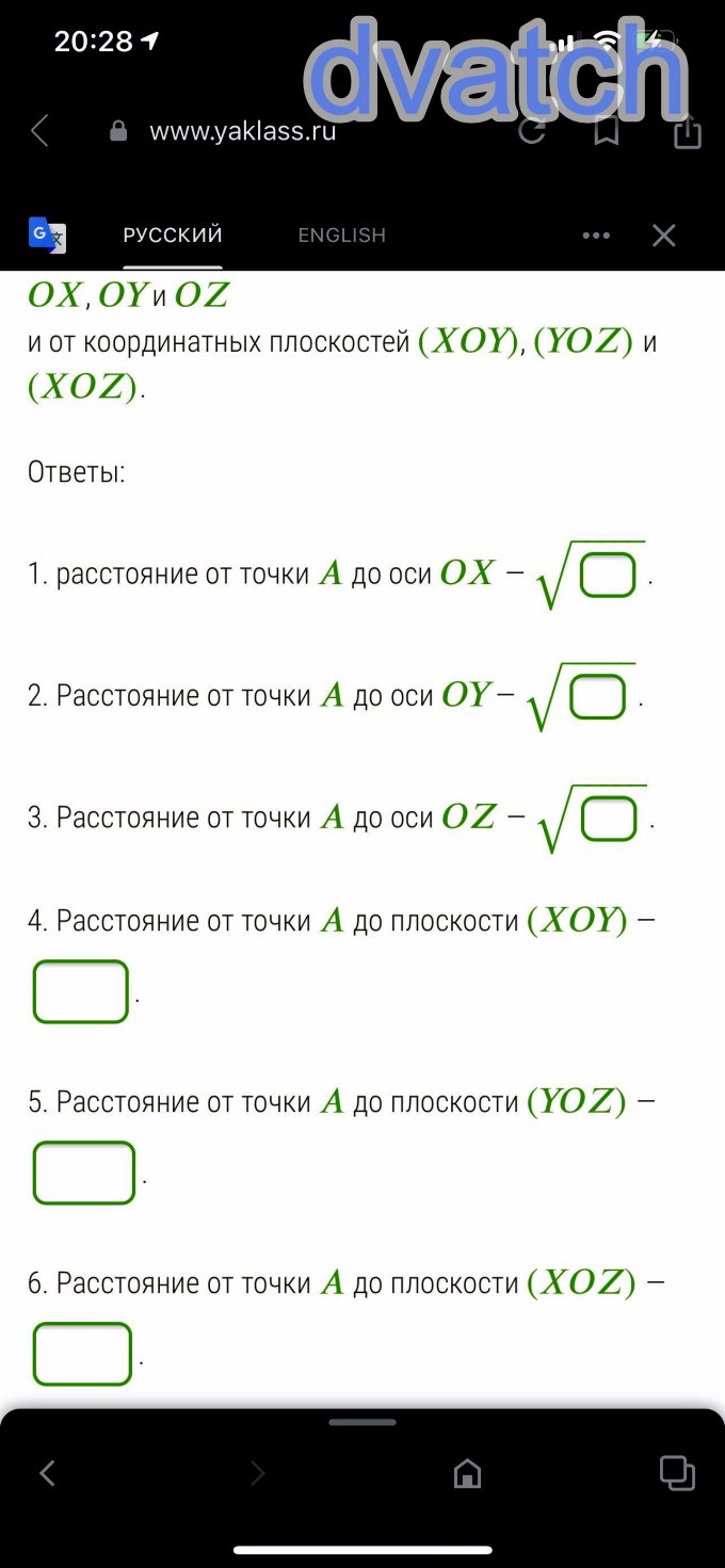 В координатной системе дана точка (4;4;8). Определи расстояния точки от координатных осей , и и от координатных плоскостей (), () и (). Ответы:1. расстояние от точки до оси — ‾‾‾‾‾√. 2. Расстояние от точки до оси — ‾‾‾‾‾√. 3. Расстояние от точки до оси — ‾‾‾‾‾√. 4. Расстояние от точки до плоскости () — . 5. Расстояние от точки до плоскости () — . 6. Расстояние от точки до плоскости () — .