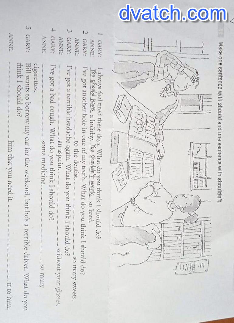 2)You should go to the dentist. You shouldn’t eat so many sweets. 3)You should take an aspirin. You shouldn’t read without your glasses. 4)You should take some medicine. You shouldn’t smoke so many cigarettes. 5)You should tell him that you need it. You shouldn’t give it to him.