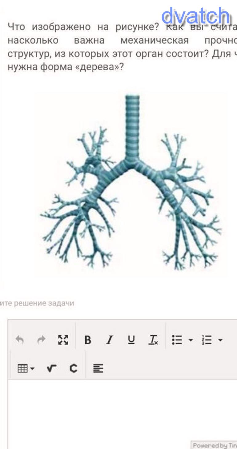 : На рисунке изображены трахея и бронхиальное дерево. Это часть дыхательной системы. Механическая прочность необходима, т. к благодаря ей просвет этих органов всегда остаётся открытым, что способствует свободному прохождению воздуха в лёгкие и обратно. Форма дерева нужна, чтобы максимально обеспечить кровь кислородом. Потому что на концах веточек самых мелких бронхов находятся альвеолы-легочные пузырьки, общая поверхность которых 100 квадратных метра!! В них происходит газообмен. Чем больше веточек, тем больше альвеол, тем больше кислорода в крови).