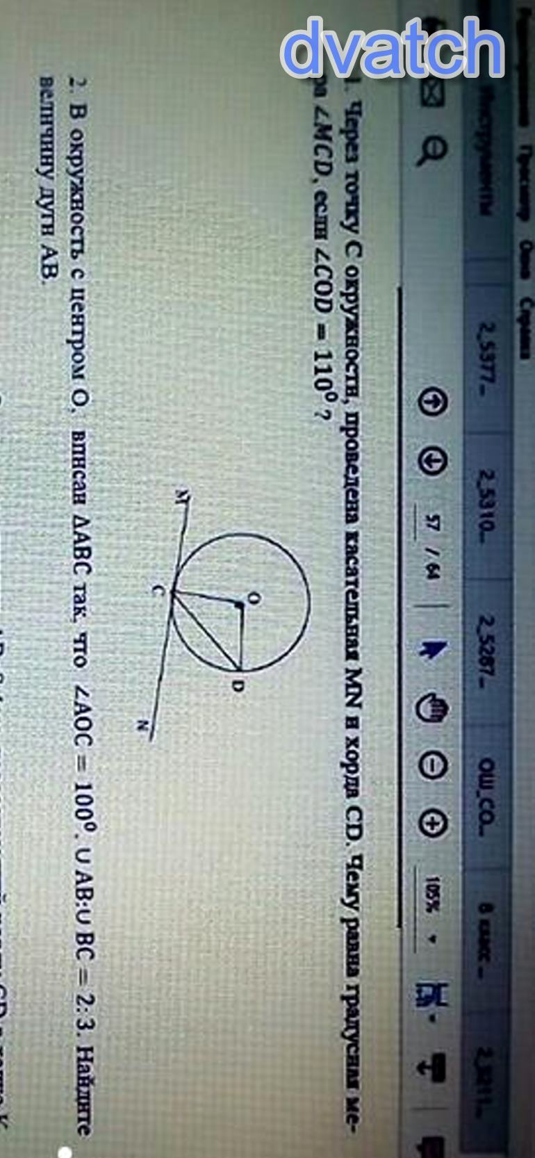 через точку С окружности, проведена касательная МN и хорда CD. Чему ровна градусная мера угла МСD, если угол COD=110°.
