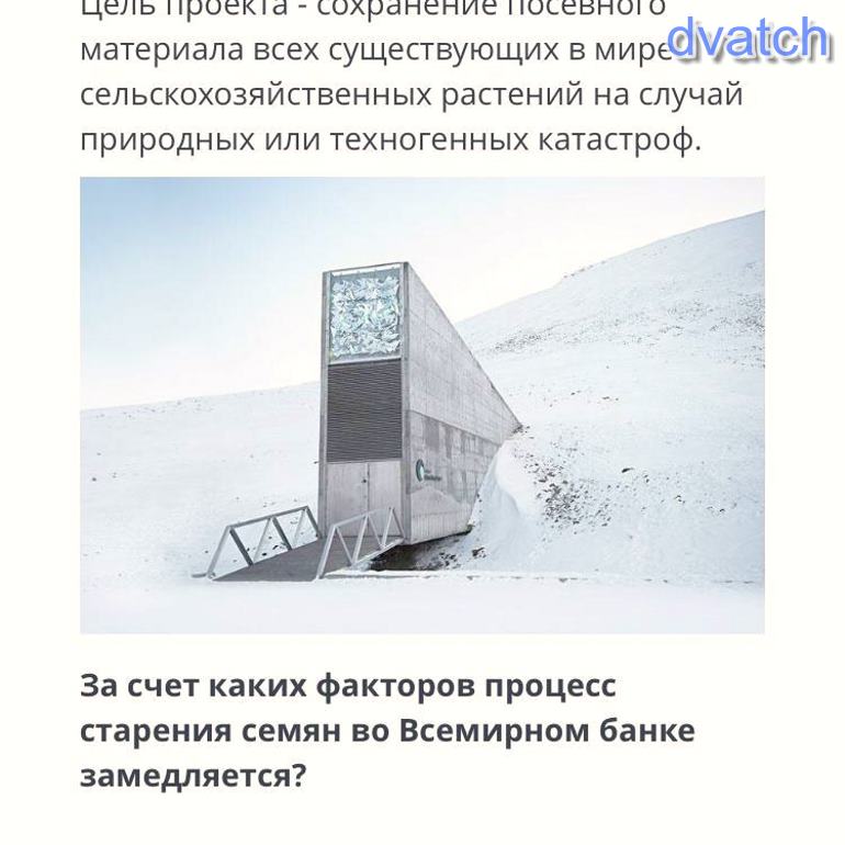 соч 26 февраля 2008 года, на острове Западный Шпицберген близ города Лонгйир (Норвегия) состоялось торжественное открытие Всемирного хранилища семян. Цель проекта - сохранение посевного материала всех существующих в мире сельскохозяйственных растений на случай природных или техногенных катастроф. За счет каких факторов процесс старения семян во Всемирном банке замедляется?