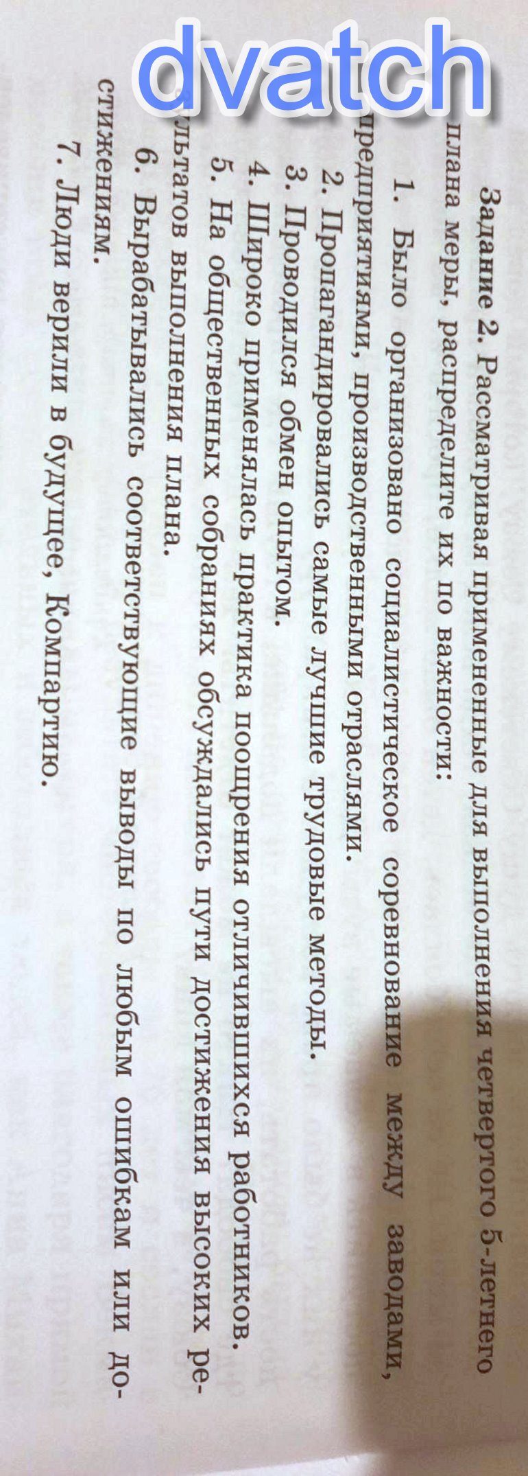 Задание 2. Рассматривая примененные для выполнения четвертого 5-летнего плана меры, распределите их по важности: 1. Было организовано социалистическое соревнование между заводами, предприятиями, производственными отраслями. 2. Пропагандировались самые лучшие трудовые методы. 3. Проводился обмен опытом. 4. Широко применялась практика поощрения отличившихся работников. 5. На общественных собраниях обсуждались пути достижения высоких ре- зультатов выполнения плана. 6. Вырабатывались соответствующие выводы по любым ошибкам или до- стижениям. 7. Люди верили в будущее, Компартию.