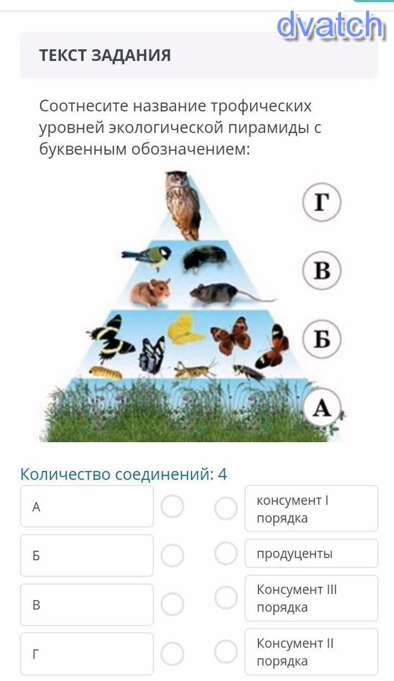 соотнеси названия трлфических уровней экологической пиромидой с буквенным обозночением