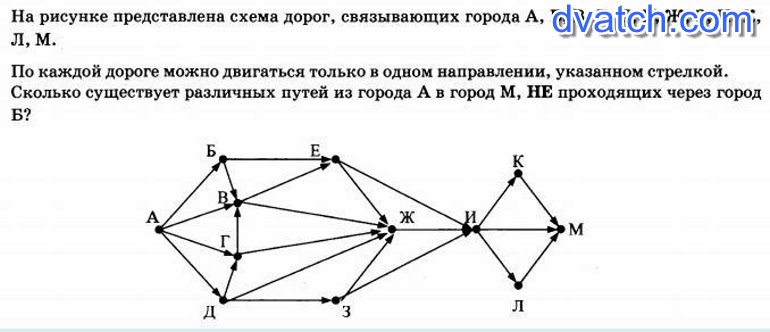 На рисунке — схема дорог, связывающих города А, Б, В, Г, Д, Е, Ж, З, И, К. По каждой дороге можно двигаться только в одном направлении, указанном стрелкой. Как узнать сколько существует различных путей из города А в город М, не проходящих через город Б