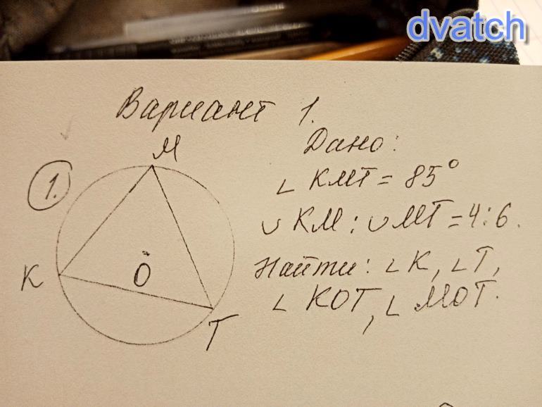 Так. Мы имеем, что угл КМТ опирается на дугу и лежит на стороне окружности, следовательно т. к длина дуги, на которой лежит окружность равна 2 градусным мерам этого угла получаем, что КТ- 170. Мы знаем, что градусная мера окружности 360 градусов, следовательно оставшаяся часть- 190 градусов. Мы знаем, что 2 дуги относятся друк к другу, как 4 к 6. Следовательно в одной находится 4 каких-то части, а в другой- 6. Следовательно из всего 10. Найдём 1 часть разделив 190 на 10 и получаем 19. Умножаем 19 на 4 и 6 и получаем, что длинна дуги КМ- 76, а длинна дуги ТМ- 114. Ну и из этого получаем ,что угл К т. к длина дуги, на которой лежит окружность равна 2 градусным мерам этого угла равен 38, а угл М равен 57. А углы КОТ и МОТ включают в себя середину окружности следовательно их градусная мера равна длине дуги, на которую они равны дуге, на которую они опираются и следовательно равны 170 и 114 соственно.