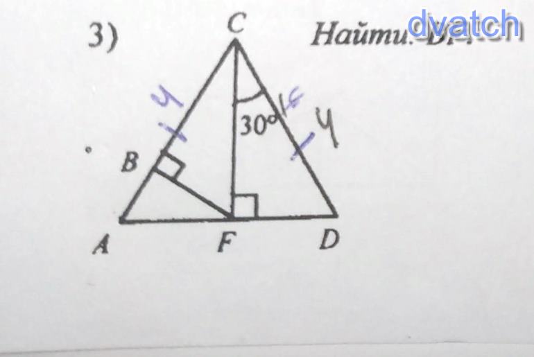 Так как ΔACD - равнобедренный и CF - высота (по усл. задачи ∠CFD = 90°), то ∠ACF = ∠DCF = 30°
