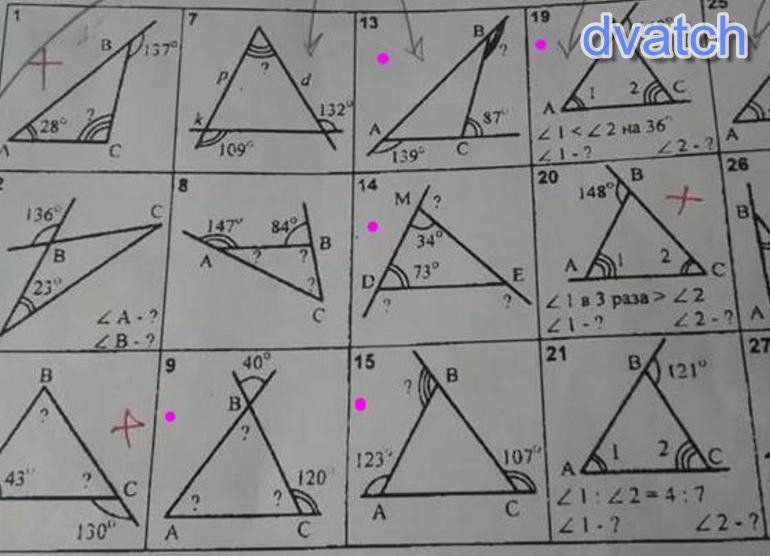 Вот все кроме 19-ой. Девятую то вертикальному углу и сумме углов треугольника. Остальные только по сумме углов и развернутому углу.