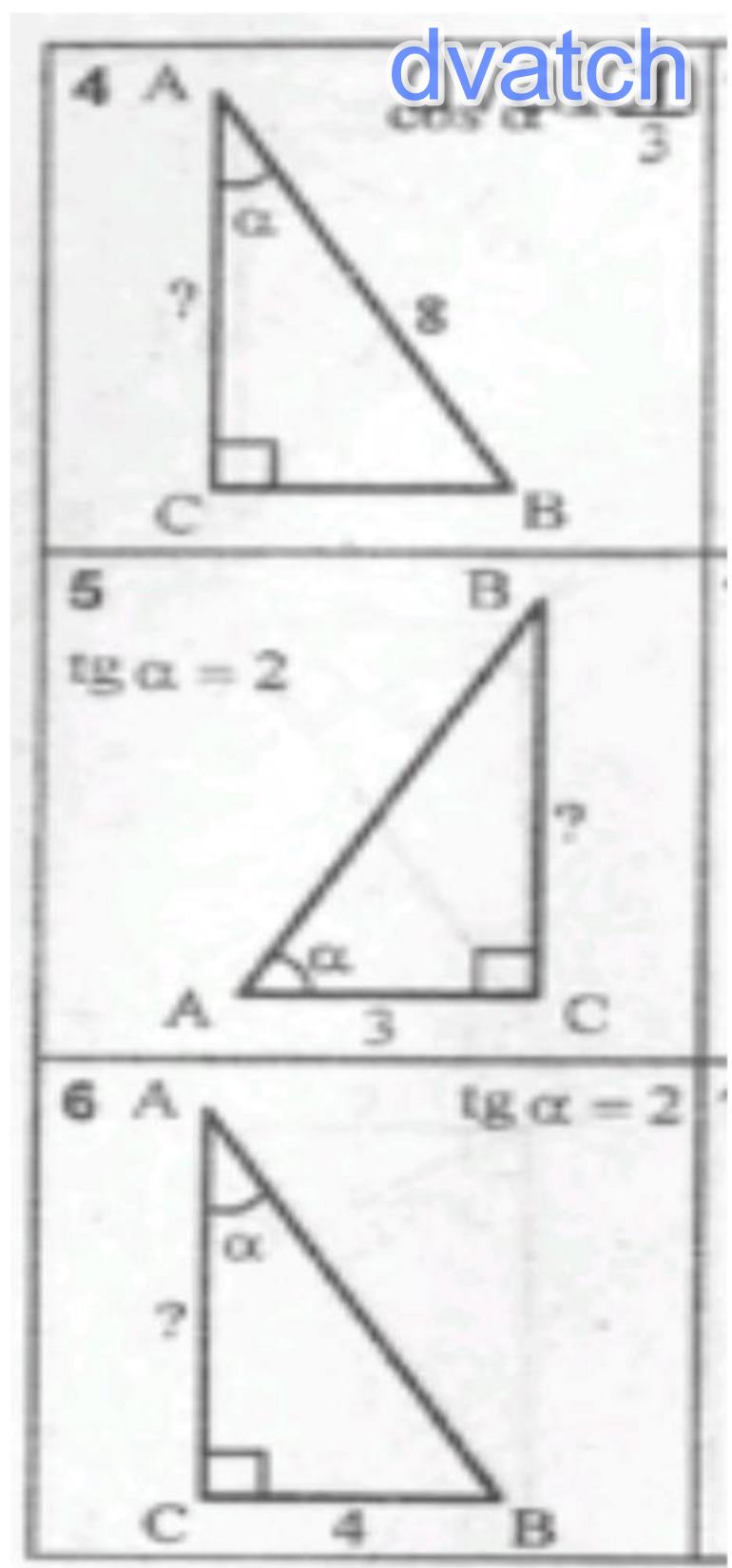 Объяснение:4) зная что cos равен отношению прилежащего катета к гипотенузе задача решается просто cosA= AC/8=1/3 тогда AC= 8/3 5) тангенс это отношение противолежащего катета к прилежащему tgA=BC/3=2 тогда BC=6 ; 6) аналогично 5 заданию tgA=4/AC =2 тогда AC=2