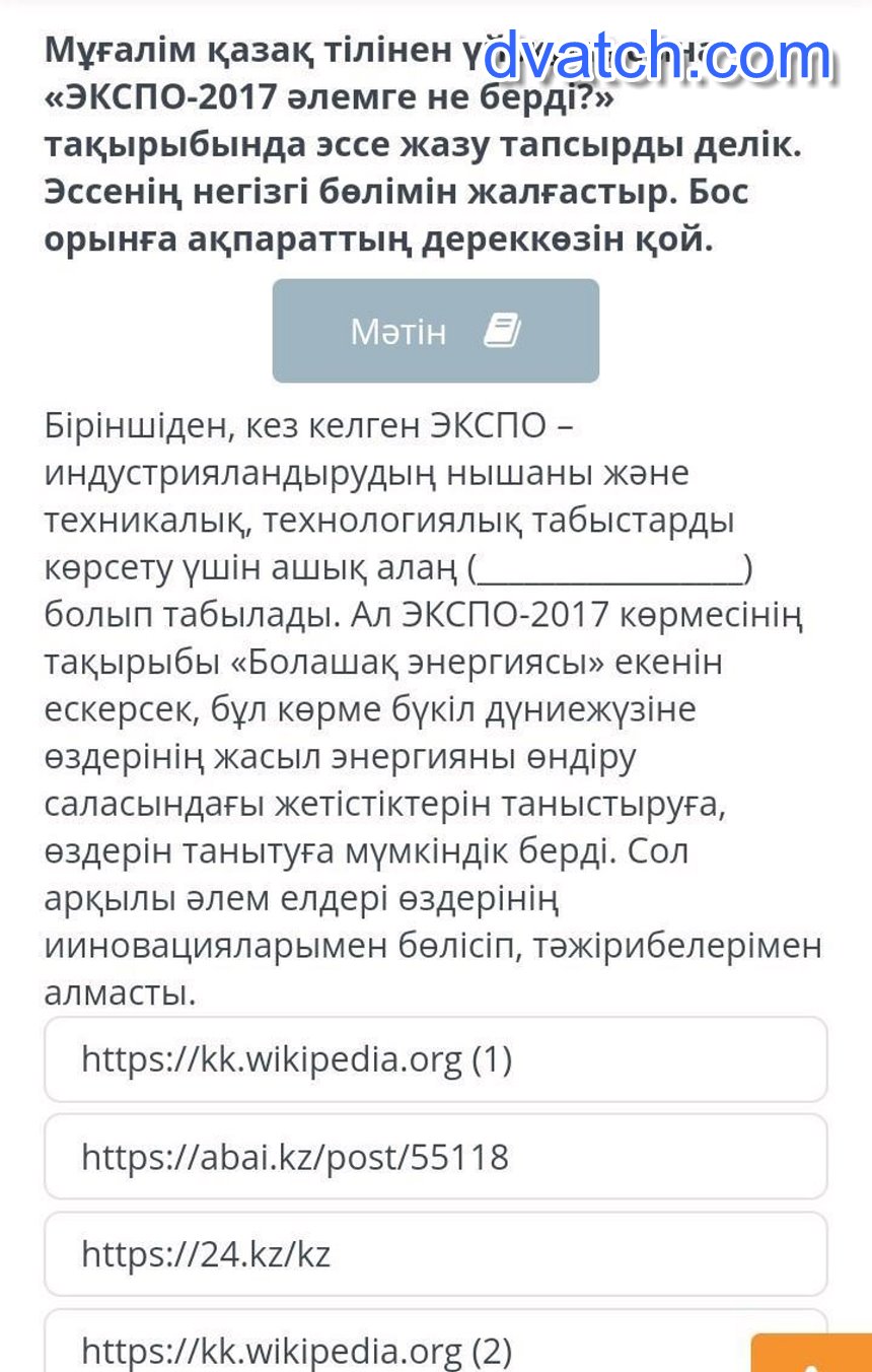 Даю 100 поинтовЭКСПО-2017 әлемге не берді?Мұғалім қазақ тілінен үй жұмысына «ЭКСПО-2017 әлемге не берді?» тақырыбында эссе жазу тапсырды делік. Эссенің негізгі бөлімін жалғастыр. Бос орынға ақпараттың дереккөзін қой. МәтінБіріншіден, кез келген ЭКСПО – индустрияландырудың нышаны және техникалық, технологиялық табыстарды көрсету үшiн ашық алаң (_________________) болып табылады. Ал ЭКСПО-2017 көрмесінің тақырыбы «Болашақ энергиясы» екенін ескерсек, бұл көрме бүкіл дүниежүзіне өздерінің жасыл энергияны өндіру саласындағы жетістіктерін таныстыруға, өздерін танытуға мүмкіндік берді. Сол арқылы әлем елдері өздерінің ииновацияларымен бөлісіп, тәжірибелерімен алмасты посчитайте с ом
