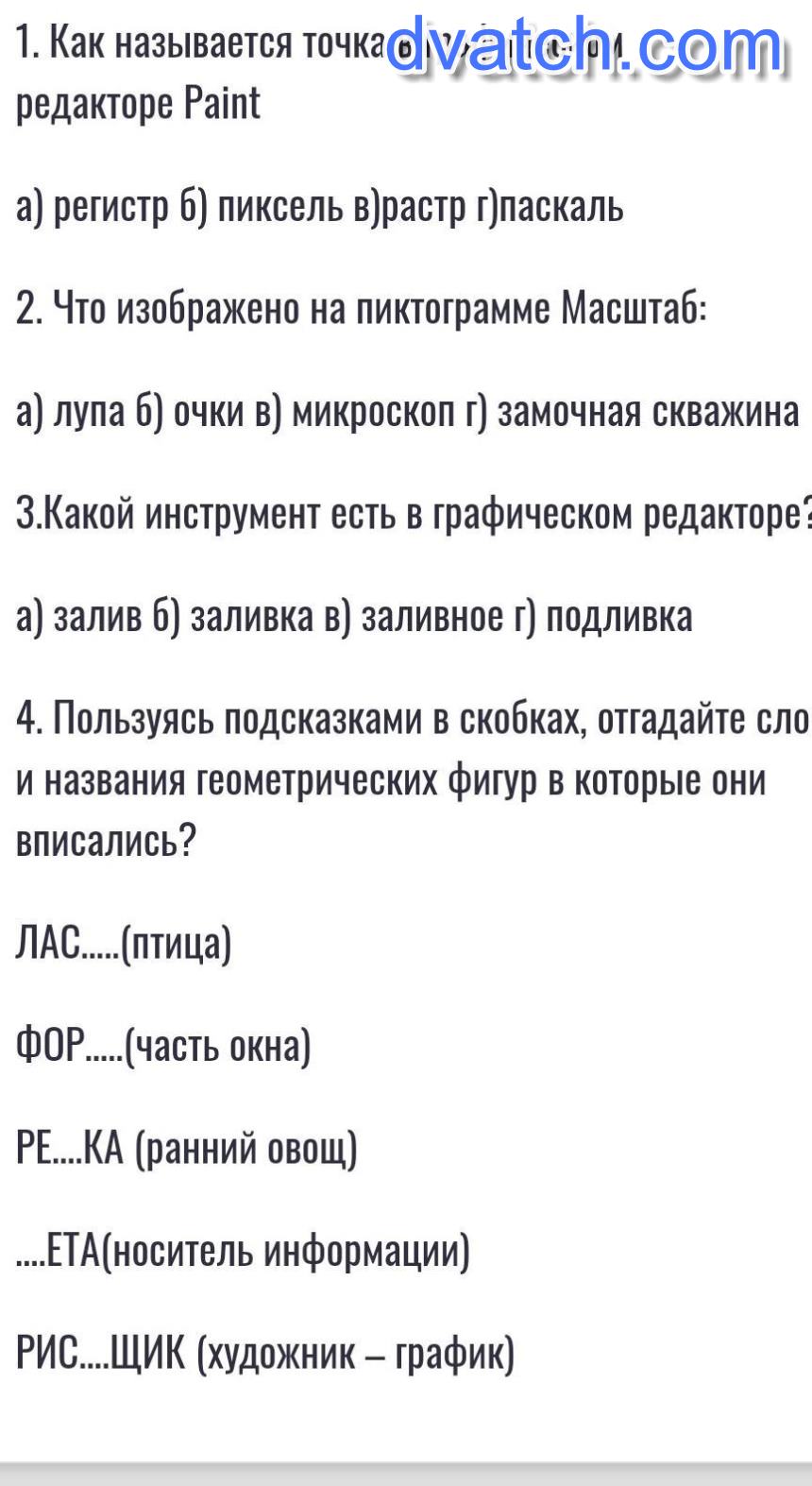 :1 б, 2 а, 3 б, 4 ласточка, форточка, редиска, дискета. Художник-График незнаю