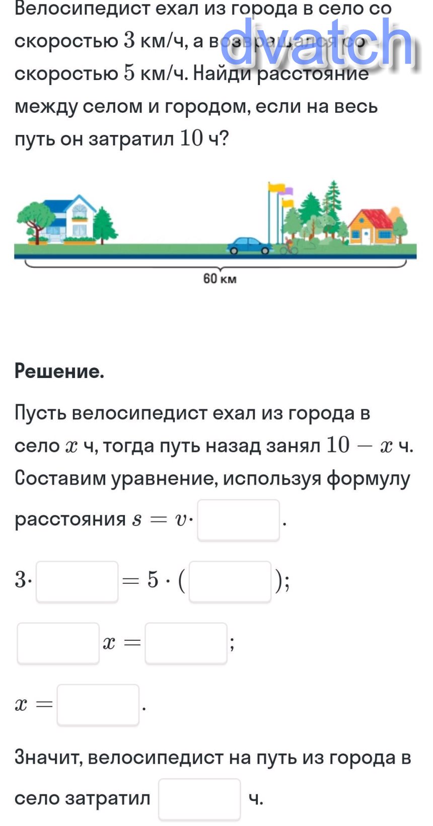 Пусть велосипедист ехал из города в село x ч, тогда путь назад занял 10-x ч. Составим уравнение, используя формулу расстояния s = v·t