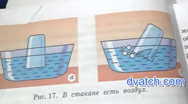2 - воздух легче воды, он стремится вверх, следовательно когда наклоняем стакан, воздух выходит через воду наружу