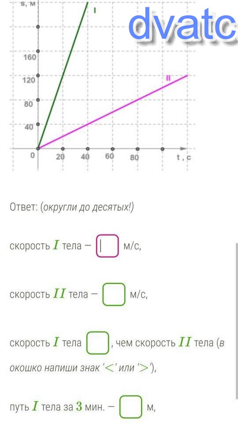 По графику зависимости путей от времени двух тел I и II, движущихся равномерно, определи скорость каждого тела. Скорость какого тела больше?Используя полученные значения скоростей, определи, какой путь пройдут тела за 3 мин. Ответ: (округли до десятых )скорость I тела — м/с,скорость II тела — м/с,скорость I тела , чем скорость II тела (в окошко напиши знак '<' или '>'), путь I тела за 3 мин. — м,путь II тела за 3 мин. — м.