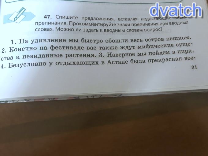 1. На удивление(вводное слово), мы быстро обошли весь остров пешком. 2. Конечно(вводн. сл. ), на фестивале вас также ждут мифические существа и невиданные растения. 3. Наверное(вводн. сл. ), мы пойдем в цирк. 4. Безусловно(вводн. сл. ), у отдыхающих в Астане была прекрасная воз-